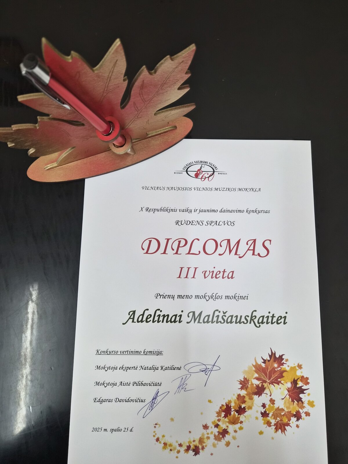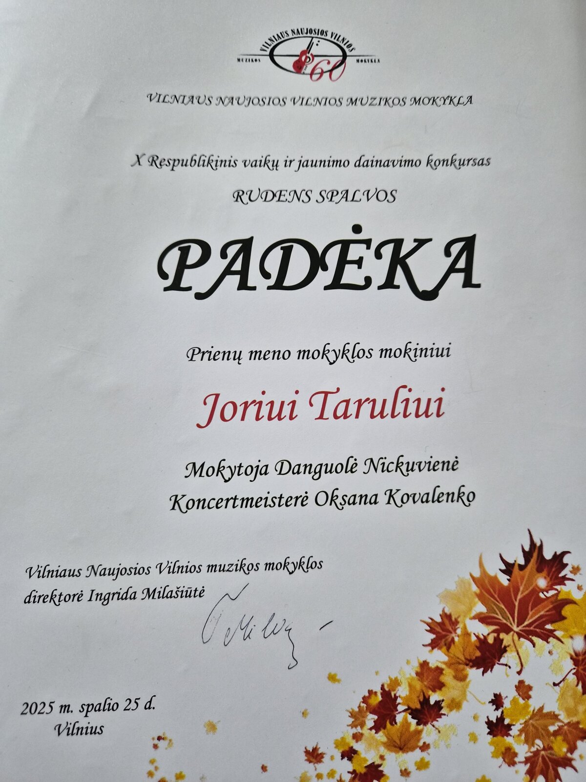 2025 m. spalio 25 d. vyko X respublikinis dainavimo konkursas „Rudens spalvos“ Vilniaus Naujosios Vilnios muzikos mokykloje. Mūsų mokyklai atstovavo B kategorijos solistė Adelina Mališauskaitė ir D kategorijos solistas Joris Tarulis, kuris atliko sudėtingą programą ir patobulino dainavimo patirtį. Iš 30 dalyvių solistė Adelina Mališauskaitė tapo III vietos laureate! Mokiniams konkurse akompanavo koncertmeisterė Oksana Kovalenko. Džiaugiuosi mokiniais, dėkoju koncertmeisterei ir linkiu kūrybinės sėkmės bei naujų pasiekimų!